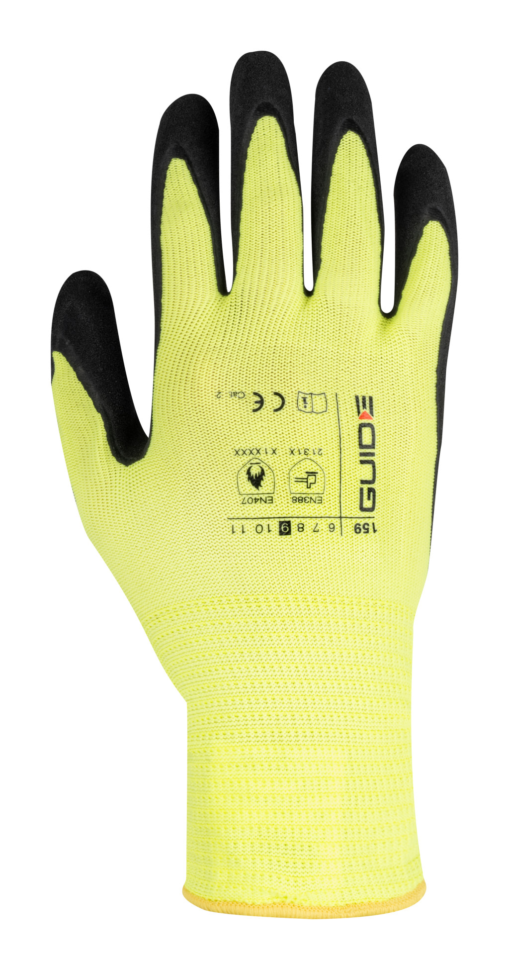 A Guide 159 vékony, hajlékony munkakesztyű, a tenyérrészen és az ujjvégeken tartós, folyadékálló latex bevonattal, szellőző kézháttal. A latex felület tökéletesen sima, így a kesztyű puha és hajlékony, mégis jó fogást biztosít nedves és száraz környezetben egyaránt. A jó láthatóság érdekében Hi-Vis sárga kivitelben. 1. szintű kontakthővel szembeni ellenállásra hitelesítve.